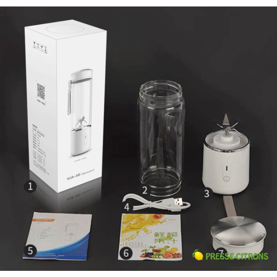 Ce mélangeur de smoothies en bouteille de luxe portable est équipé d'une batterie USB rechargeable de grande capacité de 5000mAh qui peut être facilement rechargée par toutes sortes de prise d'alimentation. Une lame à six pales en 3D : 6 pales spécialement conçues en 3D pour un mélange superbe. Corps en verre borosilicaté de qualité alimentaire à haute résistance qui peut contenir 500ml de votre boisson préférée.